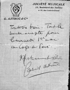 Grande appassionato di musica e membro eletto del Consistoire central israélite de France, si dedicò anche alla composizione. Scrisse arrangiamenti di preghiere per il nuovo servizio di culto concistoriale in uso presso la Grande Sinagoga de la Victoire e a partire dal 1900, pubblicò melodie (Douze mélodies, edite da Grus intorno al 1909), per lo più basate su poesie di Camille de Morlhon – un appassionato di automobili che divenne suo segretario. Compose anche pezzi per pianoforte, oltre ad Icare, épopée lyrique en 3 tableaux, basata su un poema di Henri Cain, orchestrata da Camille Erlanger. Si tratta della prima opera teatrale conosciuta ispirata all’aviazione, essendo Icare anche il nome che Henry D. diede a un aerobus d’acqua. L’opera fu rappresentata all’Opéra di Parigi il 19 dicembre 1911, durante una serata di beneficenza organizzata da Astruc a favore dell’Aeroclub de France. L’uso dei motivi si ispira a Wagner, di cui era un fervente ammiratore [3]Per un’analisi di Icare, si veda Frederico Lazzaro e Marie-Pier Leduc, « Le rêve et la science : Henry Deutsch de la Meurthe, Icare et la musique aéronautique en France avant la Première … Lire la suite e di cui aveva ascoltato le opere a Bayreuth nel 1891 e nel 1892.