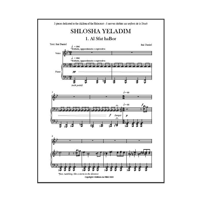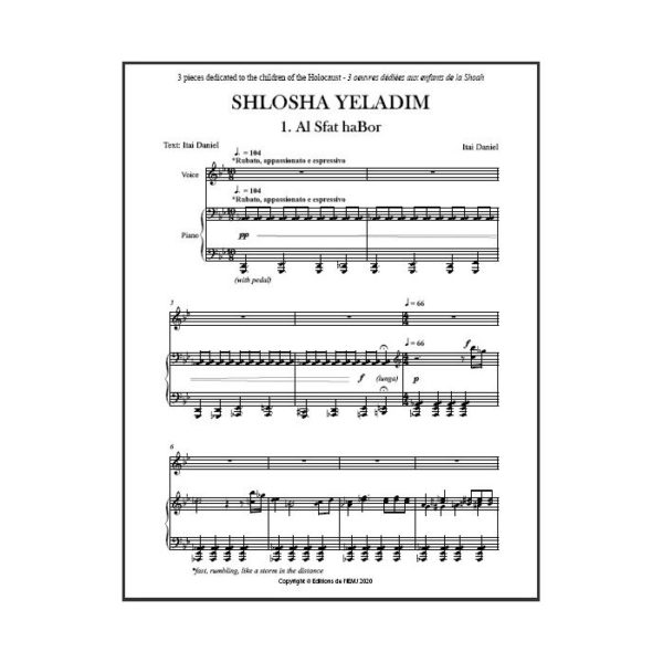In 2004, Itai Daniel moves to Paris and decides to devote himself to composition. Among his major works in the Jewish tradition are three large cantatas (Mahzor Hayim, Shma Koleinu and B’reshït) and many compositions, large and small, based on major Jewish prayers and texts (Kaddish, Oseh Shalom, Adon Olam, Kol Nidrei, Yotzer, Haskivenu, Shalom Rav and many others). Among his non-Jewish compositions are a piano sonata, a flute sonata, an Elégie for cello and piano and Shlosha Yeladim for soprano and piano (dedicated to the children perished during the Holocaust). His works have been performed in England, the United States, Germany, Italy, South Africa, and France.