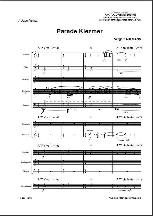 Kaufmann – Parade Klezmer, pour orchestre à vent, percussions et contrebasse