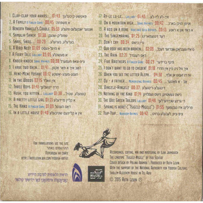 32 children’s songs and lullabies in Yiddish, sang by Ruth Levin, a beautiful CD for children and adults.