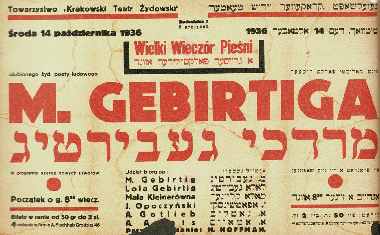 Spectacle de cabaret autour de la vie et de l’œuvre de Mordkhe Gebirtig Conçu par Gilles Rozier Avec Talila (chant), Alain Speiser (guitare), Annick Prime-Margules (lectures), Gilles Rozier (récitant) et un chœur d’hommes mené par Martin Cruchaudet. Mordkhe Gebirtig est né à Cracovie en 1877, assassiné à Cracovie en 1942 au moment où il allait être
