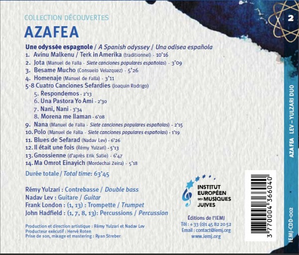 AZAFEA, le deuxième volume de la collection « Découvertes », nous entraîne au-delà des mers, sur les traces des Juifs séfarades qui ont conservé le patrimoine musical espagnol, tout en l’adaptant aux musiques des différents pays dans lesquels ils se sont installés (Turquie, Amérique du Sud, Israël…).