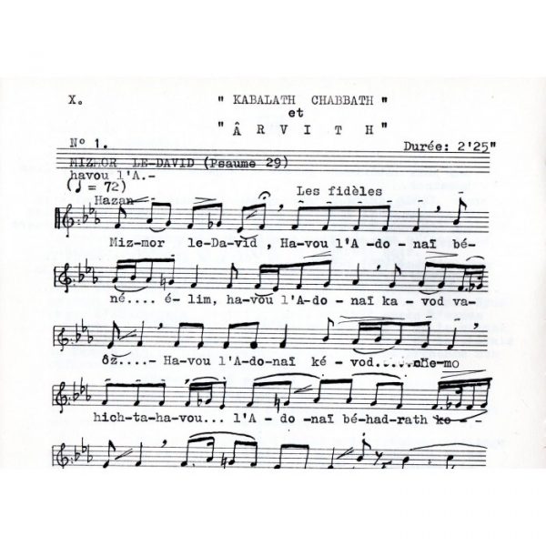 Chants liturgiques pour les offices de Kabbalath Chabbath et Arvith a l’usage des Synagogues de rite « Sepharadi ». Partition originale de Alberto Hemsi datee de 1971 a Aubervilliers. Partition du Hazzan.