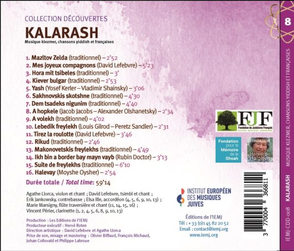 Kalarash a publié trois CD : Tirez la roulotte (2015), Mes joyeux compagnons (2019) et Nos chevauchées (2021). La présente compilation regroupe les principaux airs de musique klezmer, chansons yiddish et françaises de ces albums, ainsi que plusieurs morceaux inédits. Une belle découverte !