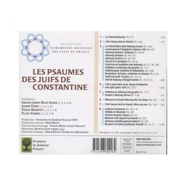 Dans ce onzième volume de la collection Patrimoines musicaux des Juifs de France, produit par la Fondation du Judaïsme Français, Monsieur le Grand rabbin René Guedj, Messieurs André Taïeb, Yohan Bismuth et Ylane Zerbib nous présentent un choix de ces psaumes dans la tradition constantinoise. Soucieux de les restituer dans leur forme et leur esprit originels ils en donnent une interprétation sans aucun accompagnement instrumental. Leur timbre voilé et nasalisé, évoquant parfois la voix flamenca, restitue de façon saisissante la tradition vocale des cours arabes de l’Espagne médiévale.