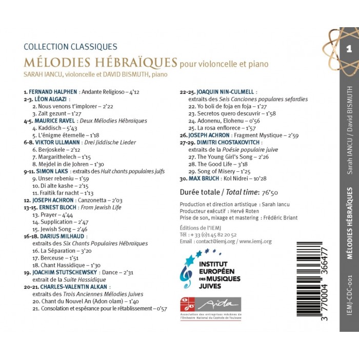 Admirablement servi par Sarah Iancu (violoncelle) et David Bismuth (piano), ce CD regroupe 30 mélodies inspirées de thèmes liturgique, hassidique, yiddish et judéo-espagnol : du célèbre Kaddish de Ravel au Kol Nidrei de Max Bruch, du cycle De la vie juive d’Ernest Bloch aux Chants populaires hébraïques de Darius Milhaud, en passant par des œuvres moins connues mais tout aussi belles de Joseph Achron, Léon Algazi, Charles-Valentin Alkan, Fernand Halphen, Simon Laks, Joaquin Nin-Culmell, Dimitri Chostakovitch, Joachim Stutschewsky ou encore Viktor Ullmann.