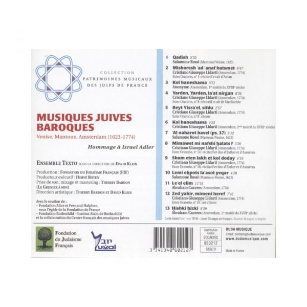 Edité par la Fondation du Judaïsme Français, ce CD a été enregistré à l’occasion d’un concert de musiques juives baroques organisé à Paris par l’Association Yuval en hommage à son fondateur, Israel Adler.