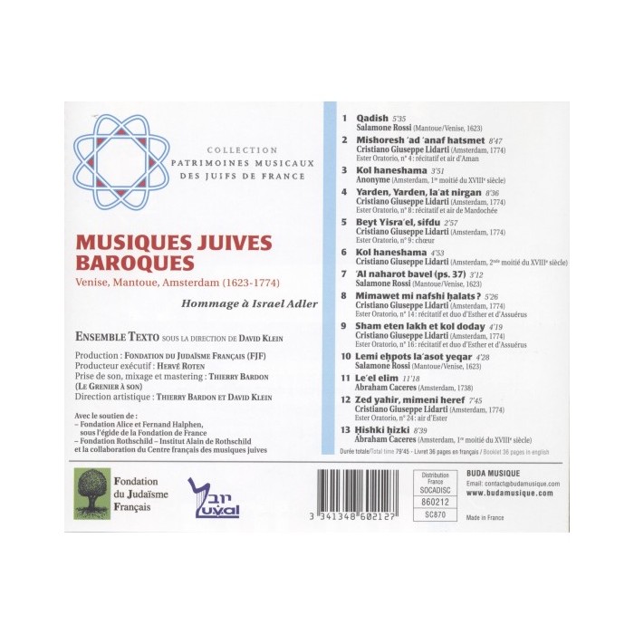Au début du 17e siècle, la Cour des Ducs de Mantoue accueille de nombreux musiciens juifs, parmi lesquels Salamone Rossi (1570 -1630 ?) qui publie à Venise, en 1622-23, un important recueil de musique synagogale contenant 33 psaumes écrits pour chœurs de 3 à 8 voix. Quelques années plus tard, cet attrait pour la musique savante polyphonique s’étend aux communautés du Comtat Venaissin ainsi qu’à Amsterdam, où les mariages, les circoncisions et les fêtes des différentes confréries sont parfois célébrés par des hymnes et des petites pièces dramatiques musicales créés pour l’occasion. Certains de ces nouveaux airs sont tellement appréciés du public qu’ils pénètrent le répertoire des chants traditionnels où ils se sont conservés jusqu’à nos jours. Le présent disque, dixième volume de la collection Patrimoines musicaux des Juifs de France, L’ensemble Texto – chœur professionnel de 8 chanteurs et chanteuses – accompagné d’un orchestre de 10 musiciens y interprètent 13 compositions de Salamone Rossi, Abraham Caceres, et Giuseppe Lidarti, qui témoignent de la beauté de la pratique musicale juive en Italie et à Amsterdam, de l’époque baroque jusqu’au début du style galant.