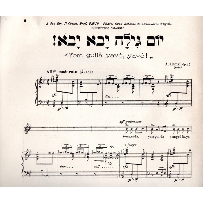 Yom Guila Yavo, yavo ! Esquisse hébraique pour chant et piano de Alberto Hemsi, op. 17. Edition originale de 1934 d’Alexandrie (Egypte)