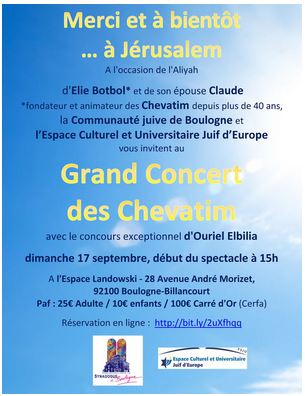 Le 17 septembre 2017 à 15h, Grand Concert des Chevatim à l'Espace Landowski à Boulogne-Billancourt (92100). …