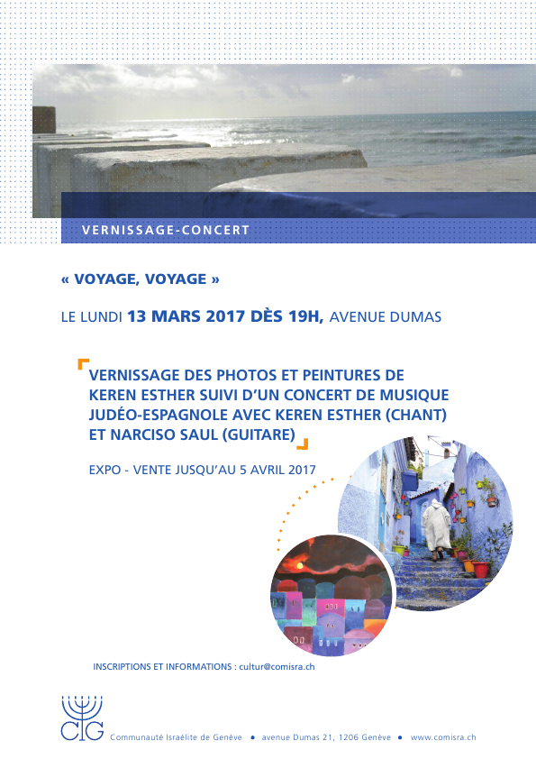 Vernissage de l’exposition « Voyage, voyage » (photos et peintures) de Keren Esther suivi d’un concert de musique judéo-espagnole avec Keren Esther (chant) accompagnée de Narciso Saul (guitare)